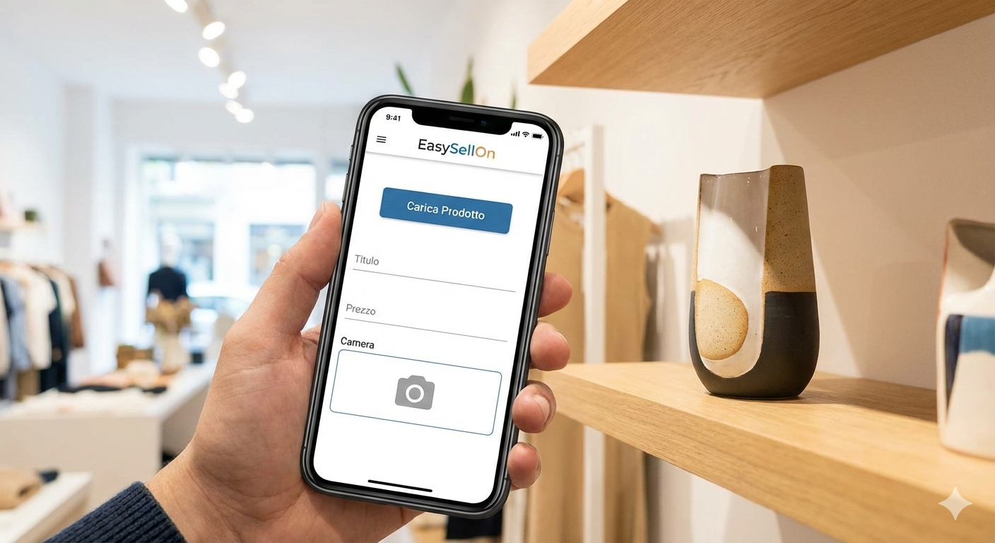 Con l'App Mobile, il ponte tra il tuo magazzino fisico e il tuo negozio online diventa istantaneo. Non dovrai mai più scaricare foto sul PC o digitare lunghi codici manualmente.