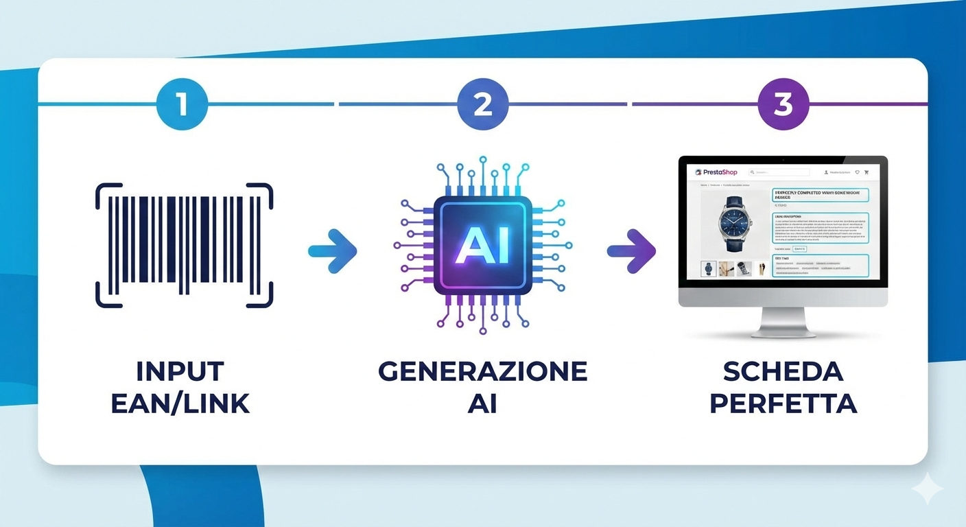 Il vantaggio? Carichi centinaia di prodotti in una frazione del tempo, con una qualità di scrittura superiore a quella manuale e un'ottimizzazione SEO nativa.